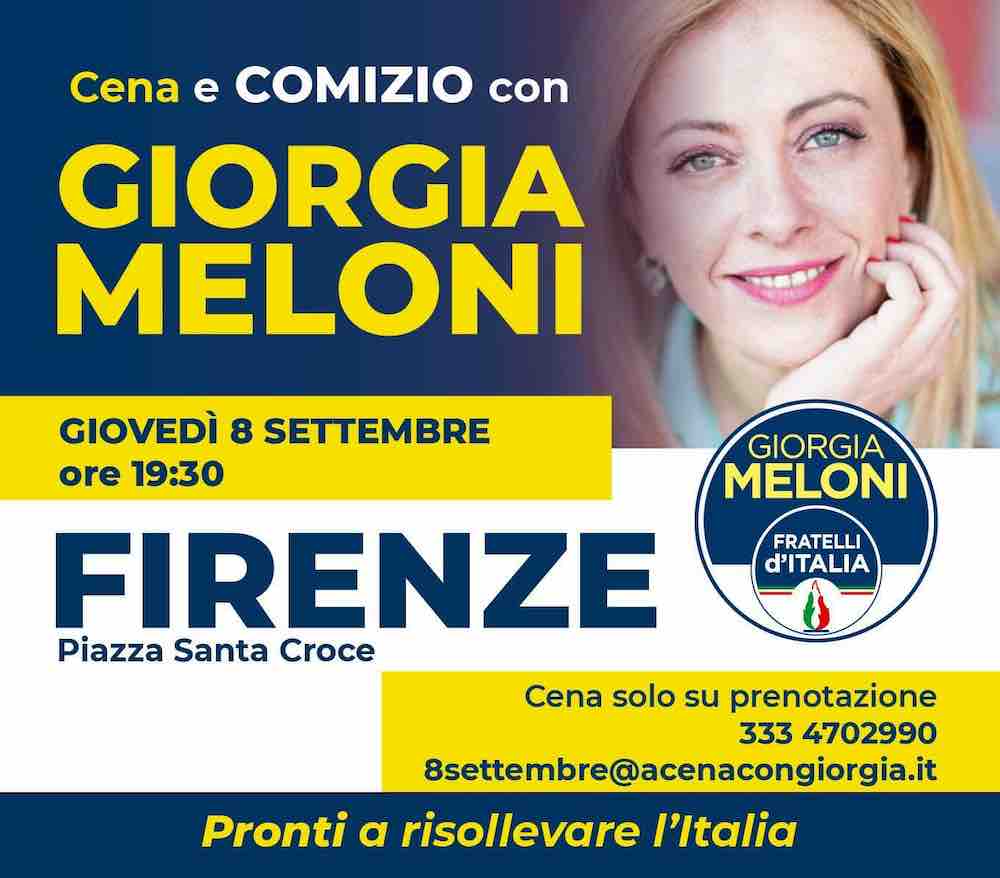 La Meloni ha deciso di giocare la battaglia politica su tutti i fronti attraverso comizi, ospitate nei talk, pubblicazione di contenuti sulle piattaforme social e la cena con i potenziali elettori. Sarà possibile cenare con la Meloni il prossimo 8 settembre a Firenze, al termine del comizio del presidente di FdI in piazza Santa Croce. Un evento al quale potranno comunque prendere parte solo pochi commensali: la prenotazione per cenare con la politica romana è obbligatoria.