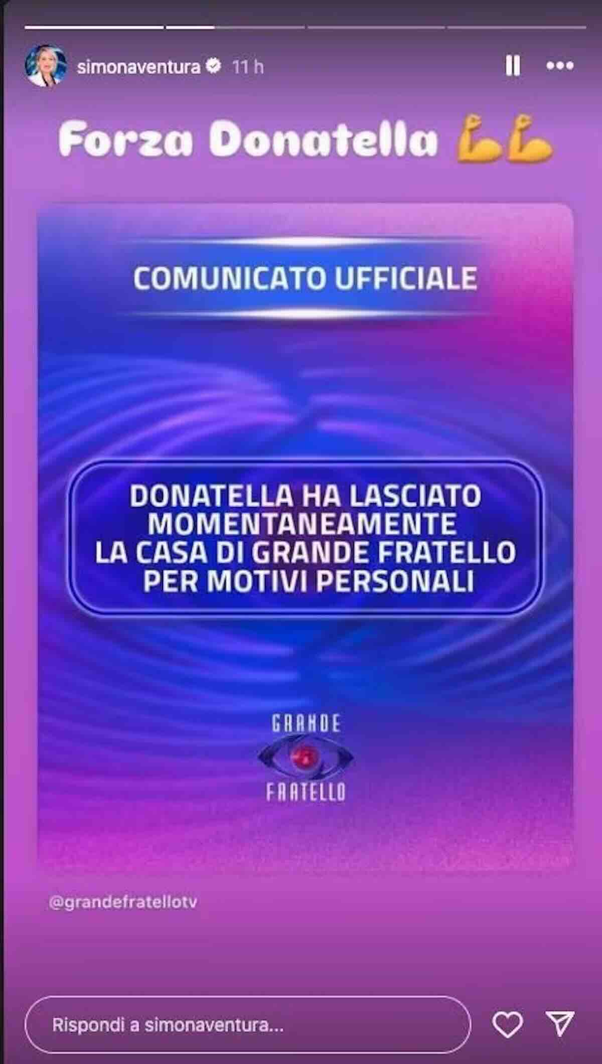 In questa circostanza, però, il clima appare diverso. Donatella non ha ancora fatto ritorno nella Casa e il silenzio che circonda il suo caso alimenta il sospetto che si tratti di una questione più delicata. Unico spiraglio arriva da Simona Ventura, che ha postato una storia su Instagram con un messaggio semplice ma carico di calore: “Forza Donatella”. Poche parole, che non spiegano ma fanno intuire vicinanza e una certa apprensione, forse anche l’auspicio di rivederla presto in gioco.
