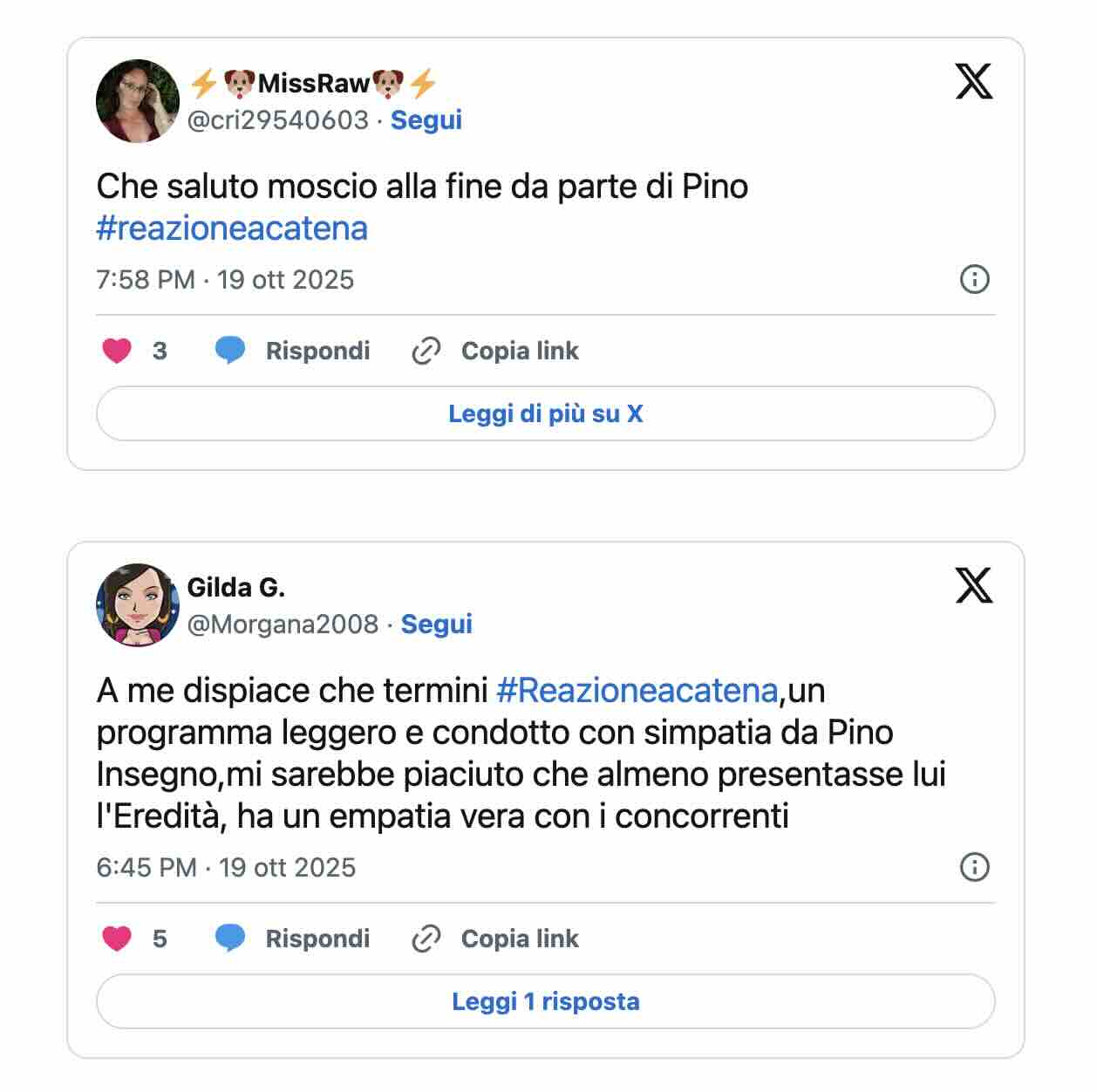 Tra i molti commenti apparsi online, uno in particolare ha colto lo spirito del momento: “Saluto poco incisivo da parte di Pino”, ha scritto un utente su X, abituato a un approccio più caloroso e teatrale. Ma l’uscita di scena era tutt’altro che improvvisa. Era già noto da tempo che Insegno avrebbe lasciato la guida del programma al termine della stagione, per fare spazio al ritorno di Marco Liorni alla conduzione de L’Eredità. Si tratta della consueta rotazione che ogni anno anima il palinsesto pomeridiano della rete ammiraglia Rai. Tuttavia, il modo in cui il passaggio è avvenuto ha colto di sorpresa molti spettatori affezionati.